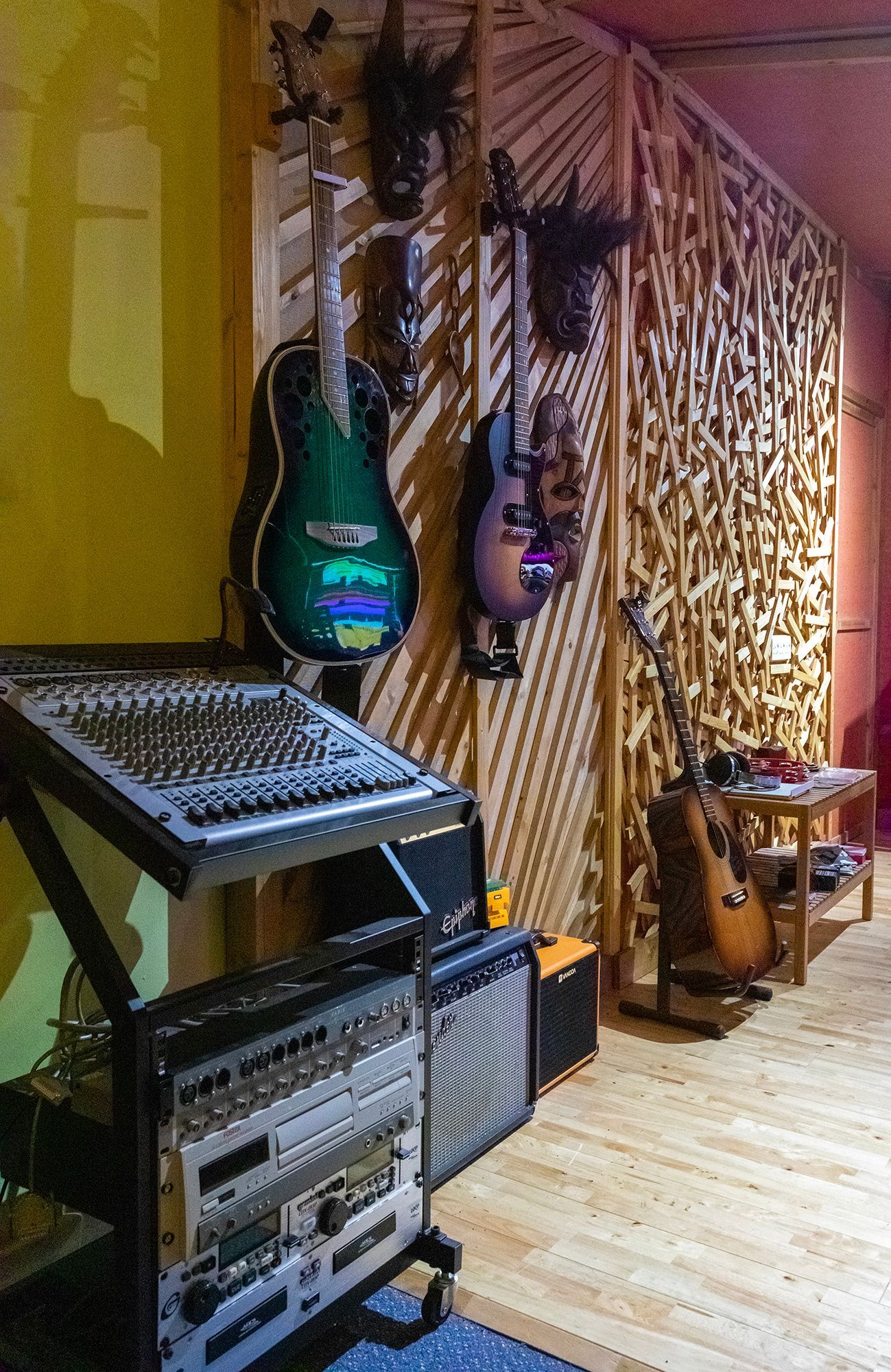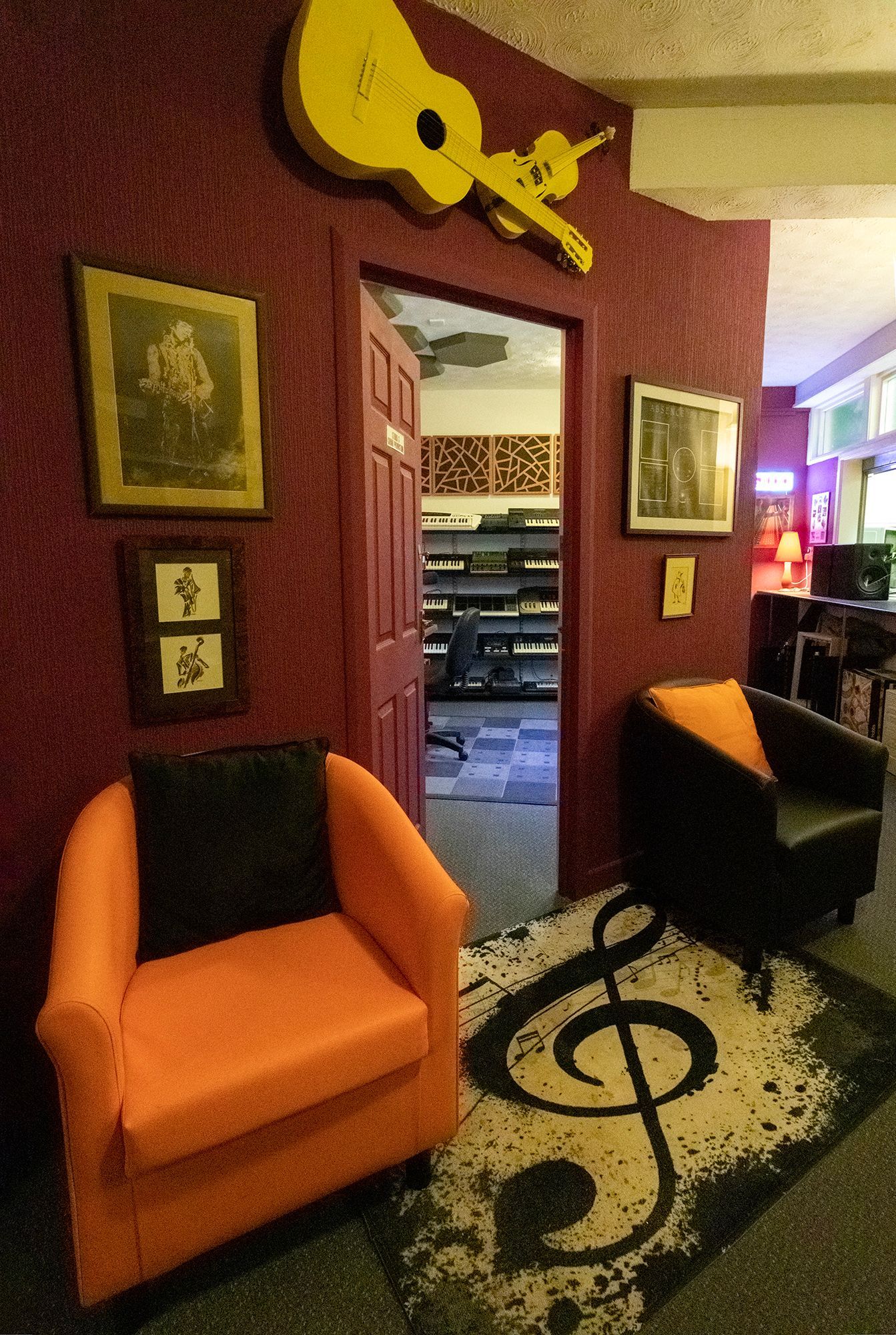 Studio One control room is fully air-conditioned, with Broadband internet access. The live room was specifically designed to allow musicians to play and record together. Many studios cannot offer this facility. The BBC consider that a recording room smaller than 1500 cubic feet cannot support accurate recording for acoustical reasons - Horizontal Music Studios is over 2500 cubic feet, large enough for a Band or small Choir, yet not too big to make a solo performer feel lost. Acoustics apart, musicians like to play together so Horizontal Music make it possible.