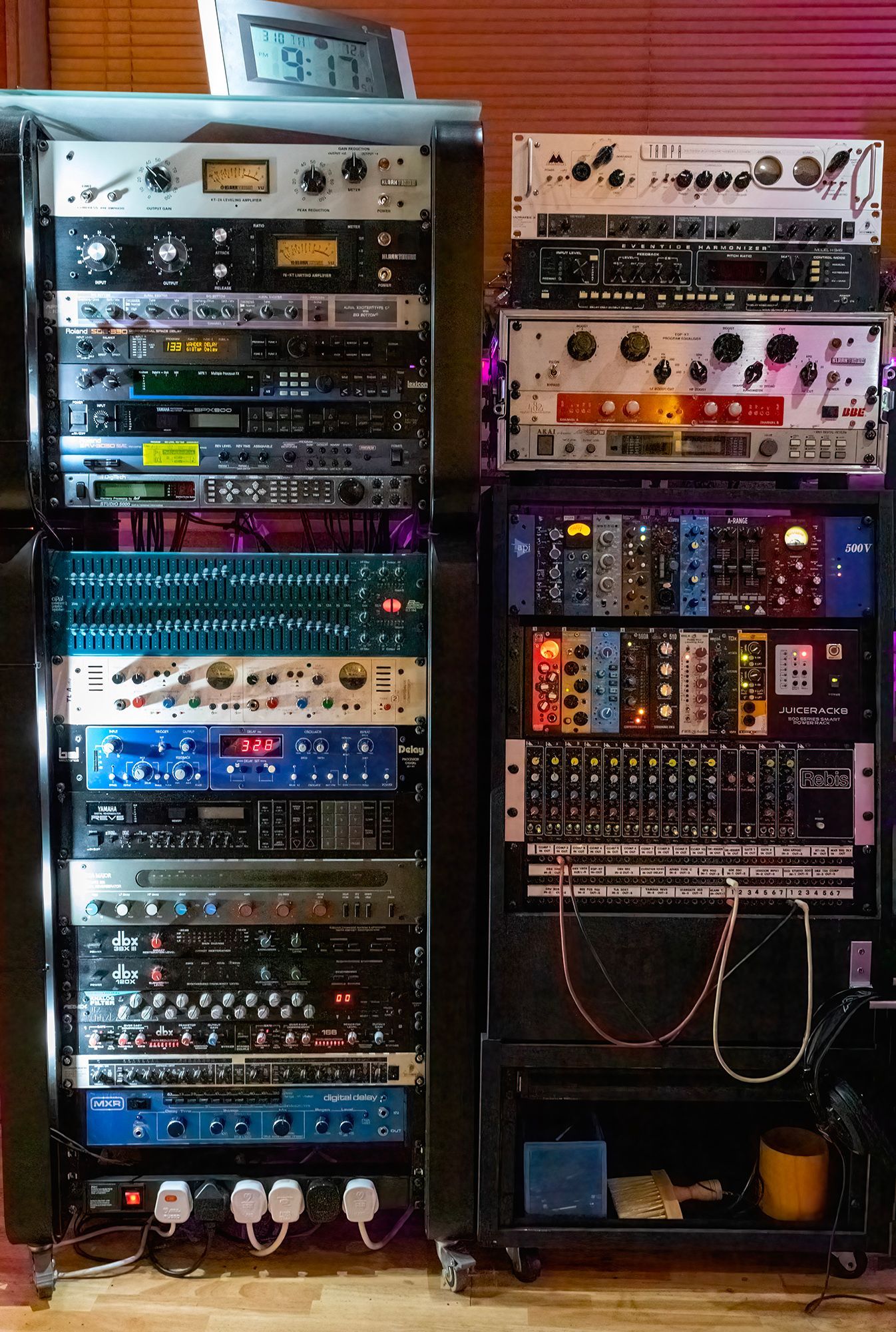 Monitoring is by large 15" Tannoy Golds (rebuilt by Lockwood in 2018) with quad amps, active Adam and Mackie monitors and Yamaha NS10's.